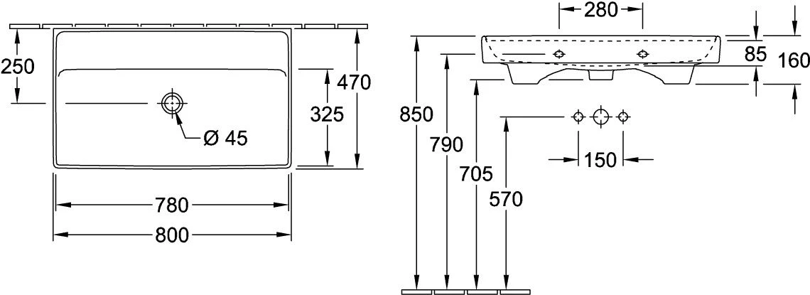 - ohne Überlauf, ohne Hahnloch, 80x47cm, weiß