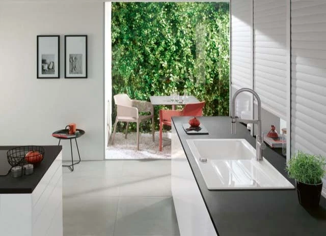 - da die Kalt- und Warmwasserregulierung jeweils um 45° in Richtung Küchenspüle und in Richtung Wand erfolgt